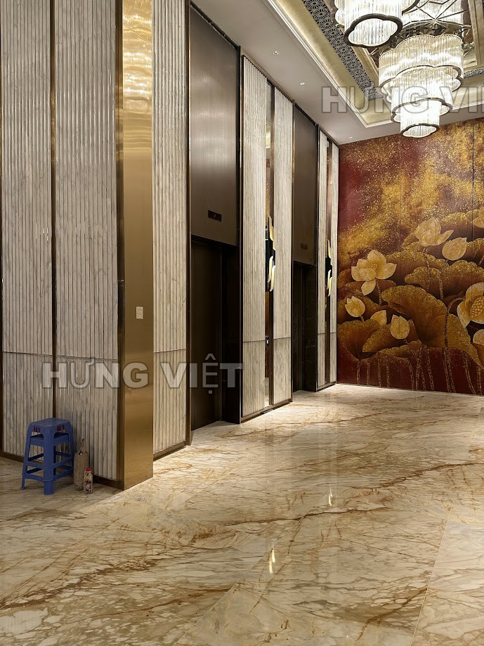 Thi công khung bao bản rộng thang máy với chất liệu inox 304 vàng hồng xước, bề mặt xước mờ sang trọng, chống bám vân tay.